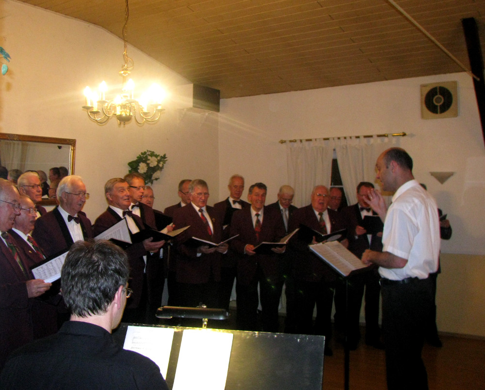 Darunter waren erstmals die „Goschenhobler“, die Mundharmonikagruppe des MGV „Germania“ Wettmar. Deren Sprecher, Hans-Heinrich Günther, erklärte auch gleich, dass die Wortfindung seiner Combo etwas mit Mund und Mundarbeit zu tun habe. Die „Goschenhobler“ fühlten sich in ihrem Element und ließen den Vereinsvorsitzenden Hartmut Ammann, der durch das Programm führte, verschiedene Male unverrichteter Weise wieder von der Bühne abtreten. Aber: Die „Goschenhobler“ kamen mit ihrer ungezwungenen und volkstümlichen Art beim Publikum sehr gut an, welches gesanglich immer wieder mit anstimmte. Zudem gab Goschenhobler Horst Frauboes ein eindrucksvolles Solo zu „Lili Marleen“ zum Besten. In bewährter Manier leitete Chorleiter Harald Seipold die Neuwarmbüchener Teilchöre „Immergrün und Rosenrot“ und Frauenchor „Rosenrot“, die verschiedene schöne Lieder, wie „Amazing Grace“ und „Die Legende von Babylon“, eindrucksvoll vortrugen. Unterstützt wurden sie dabei zum Teil von Martin Schulte am Klavier. Auftakt und Schluss des Konzerts kamen von einer mannstarken Chorgemeinschaft aus den Männergesangvereinen „Immergrün“ Neuwarmbüchen und „Germania“ Wettmar unter der Leitung von Matthias Blazek. Dieser sagte eingangs: „Ohne diese Männer kann ich mir ein Leben nicht mehr vorstellen“, was mit einem starken Applaus honoriert wurde. Hartmut Ammann wies darauf hin, dass die Zusammenarbeit beider Chöre eine sehr gute sei und dass die Chorgemeinschaft im zurückliegenden Jahr so manches Festival mit ihrem Gesang bereichert habe. Das Konzert fand seinen Abschluss mit der Schiller-Beethoven-Komposition „Freude schöner Götterfunken“, dargeboten von der Chorgemeinschaft „Immergrün“ Neuwarmbüchen/„Germania“ Wettmar und den „Goschenhoblern“.